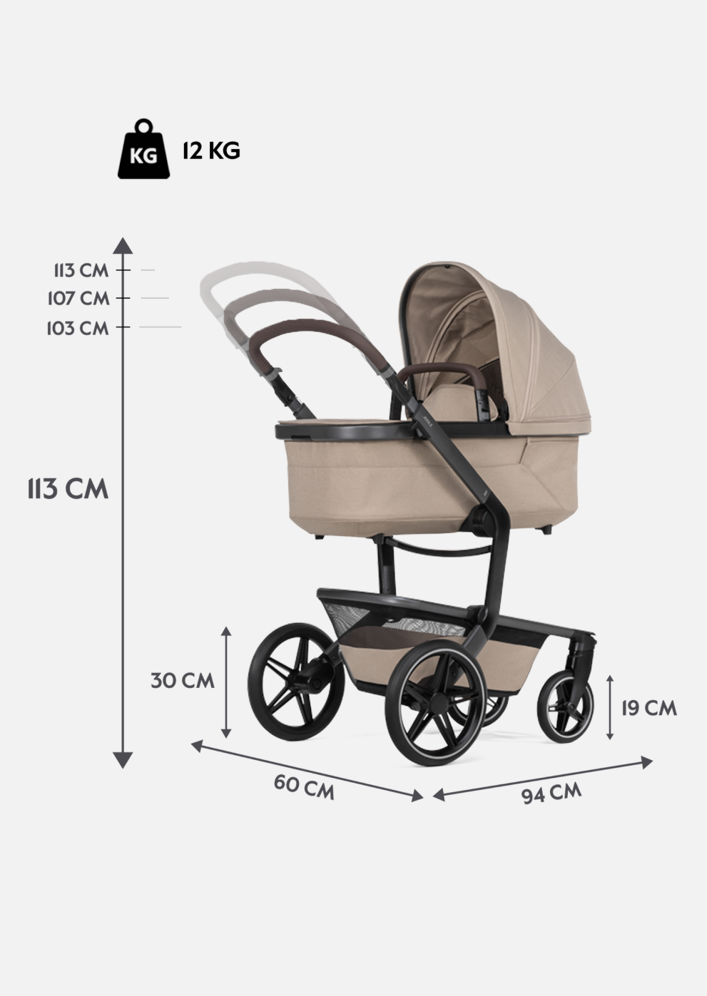 • Шасси + прогулочное сиденье (Д х Ш х В): 81,5 - 100 х 60 х 103,5 - 113 см