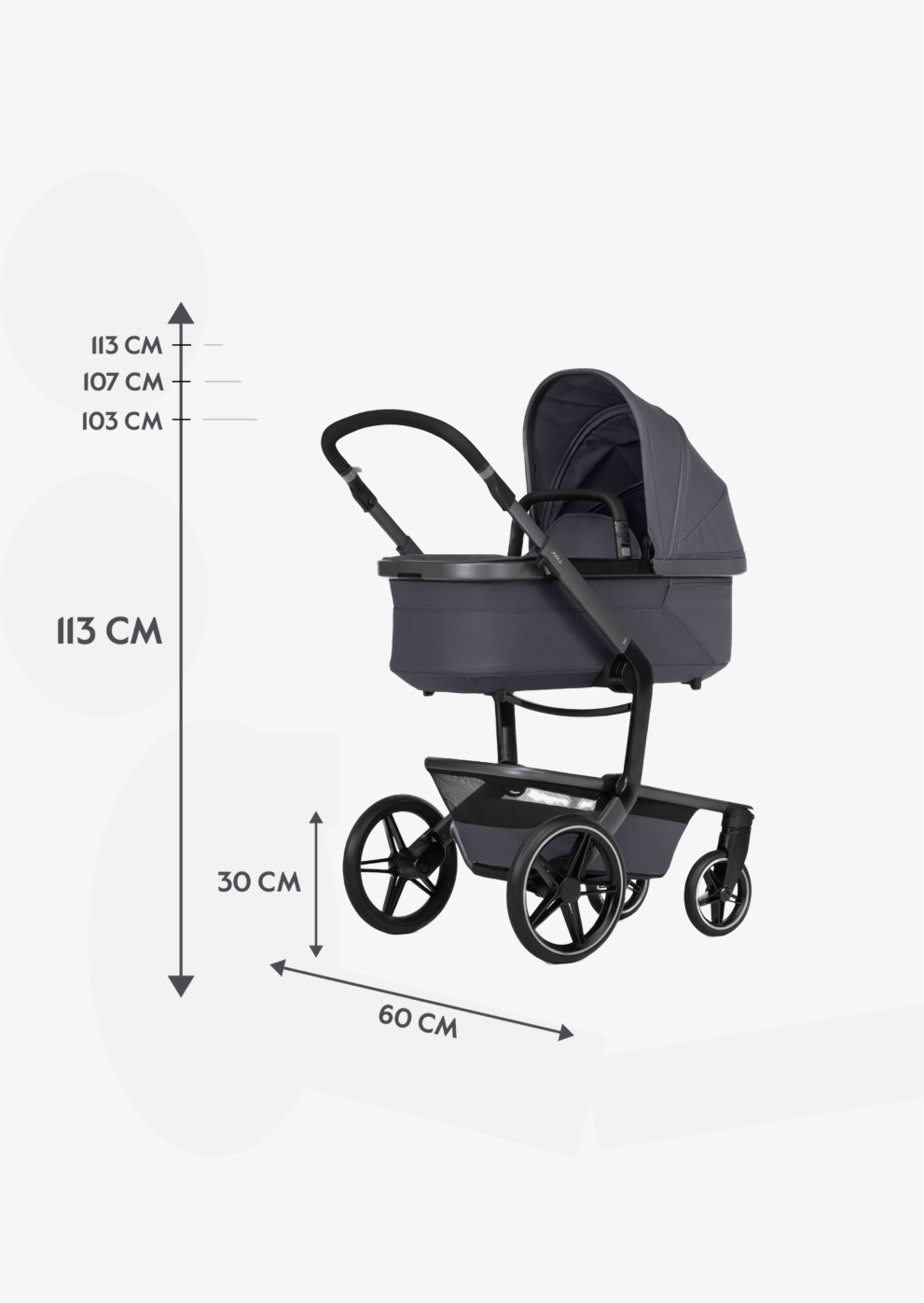 • Шасси + прогулочное сиденье (Д х Ш х В): 81,5 - 100 х 60 х 103,5 - 113 см