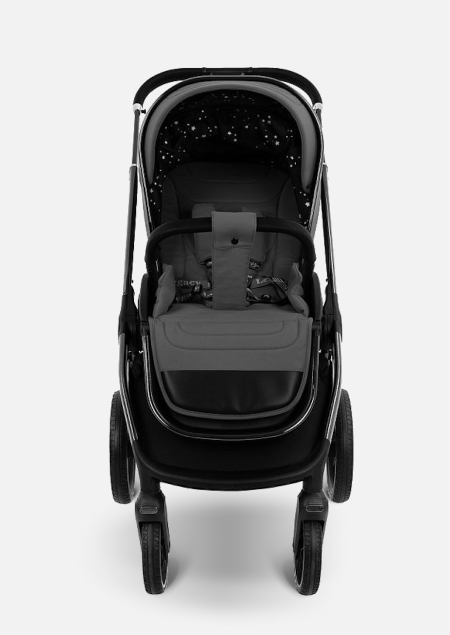 - Рама из облегченного алюминия с покрытием Black Chrome имеет повышенную износостойкость и компактно складывается по типу "книжки" вместе с прогулочным блоком.